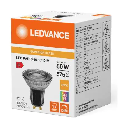 Descrizione Ledvance LED PAR16 GU10 Riflettore 8.3W 575lm 36D - 927 Bianco Molto Caldo | Miglior Resa Cromatica - Dimmerabile - Sostitutiva 80W