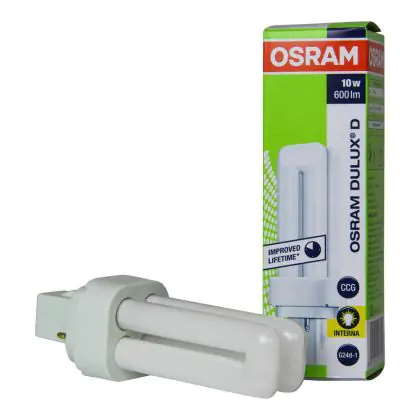 Questa lampada fluorescente compatta Dulux D OSRAM presenta l’attacco a innesto G24d-1 con due spinotti. Grazie alla tecnologia a fluorescenza, è un’ottima soluzione per un’illuminazione affidabile con un consumo energetico di 10W. È adatta per un’installazione negli apparecchi luminosi dotati di alimentatore convenzionale.