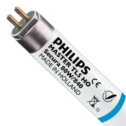 Philips TL5 High Output Secura or MASTER TL5 HO Secura sono tubi fluorescenti di 16 mm di diametro. Questi tubi hanno la particolarità di essere protetti da un involucro esterno che previene i rischi in caso di rottura del vetro, mantenendo un'illuminazione ad alta efficienza. Queste lampade devono essere usate con un reattore elettronico. Philips TL5 HO Secura 80W 840 - 145cm misurano 145 cm e hanno un attacco G5.