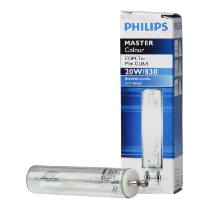 Le Philips CDM-Tm Mini 20W 830 GU6.5 (MASTERColour) sono lampade a scarica compatte ad alogenuri metallici estremamente efficienti che presentano una potenza di 20W e sono dotate di attacco del tipo GU6.5. Queste lampade a scarica compatte hanno una vita media di 15.000 ore e producono una luce bianca brillante. La resa dei colori delle Philips CDM-Tm Mini 20W 830 GU6.5 (MASTERColour) é molto buona grazie all'indice di resa cromatica di 80-89Ra: questo sta ad indicare che le caratteristiche degli oggetti illuminati sono poste in risalto in maniera ottimale.