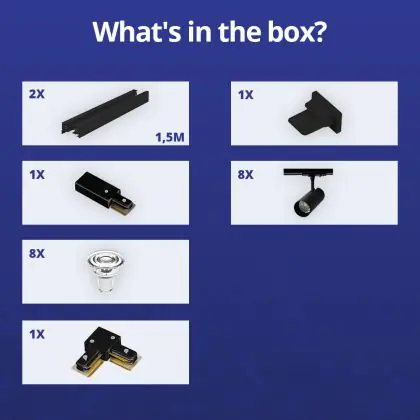 | Nome del fabbricante | Complete L shaped 1-Phase Track Set Black incl. 8x Spot fixture + GU10 2700K 3W Dim – 1,5 x 1,5 mete | |